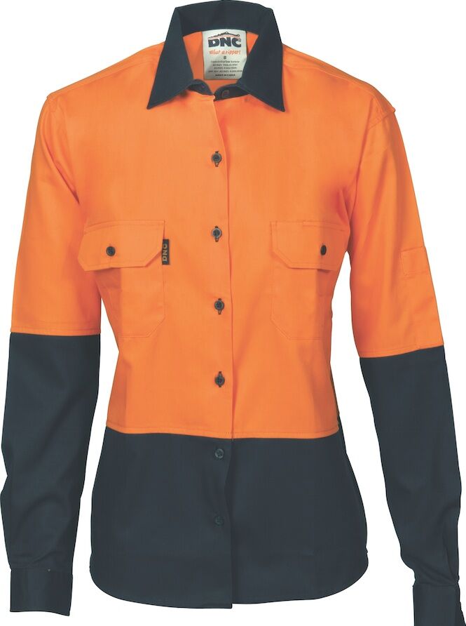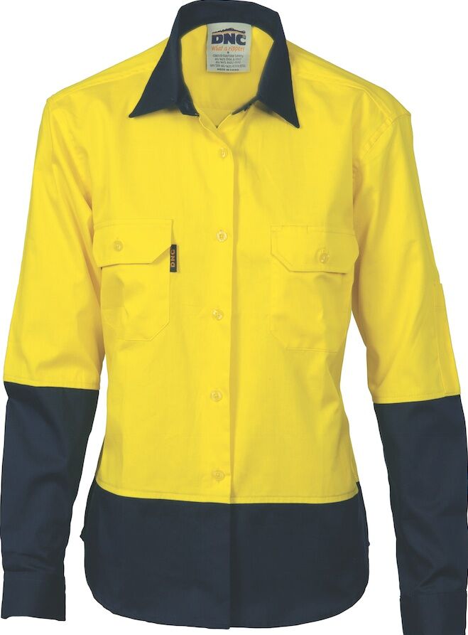 3932; DNC Workwear Ladies Hi-Vis Two Tone 190gsm Cotton Drill L/S Shirt