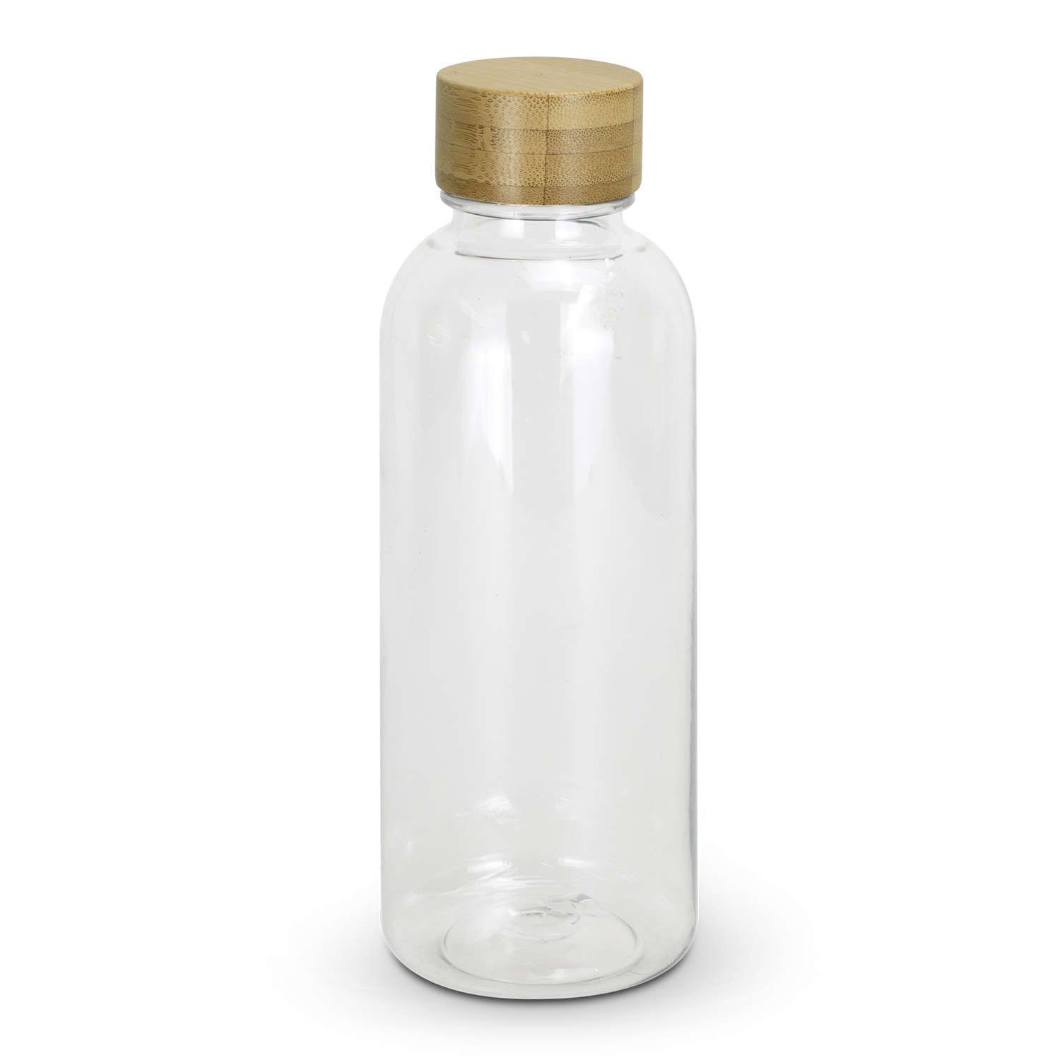 Handy 650ml clear bottle made from recycled polyethylene terephthalate (RPET) plastic. It features a bamboo natural lid with a silicone seal.