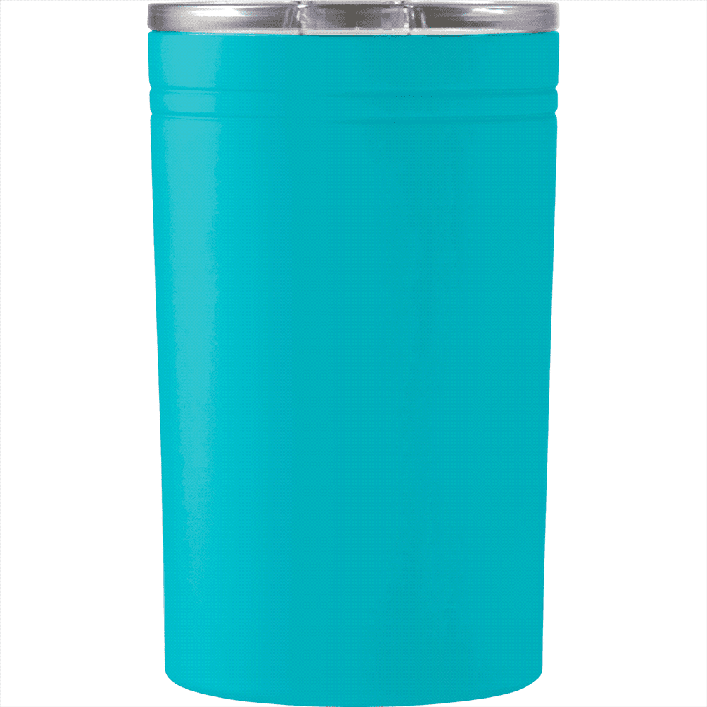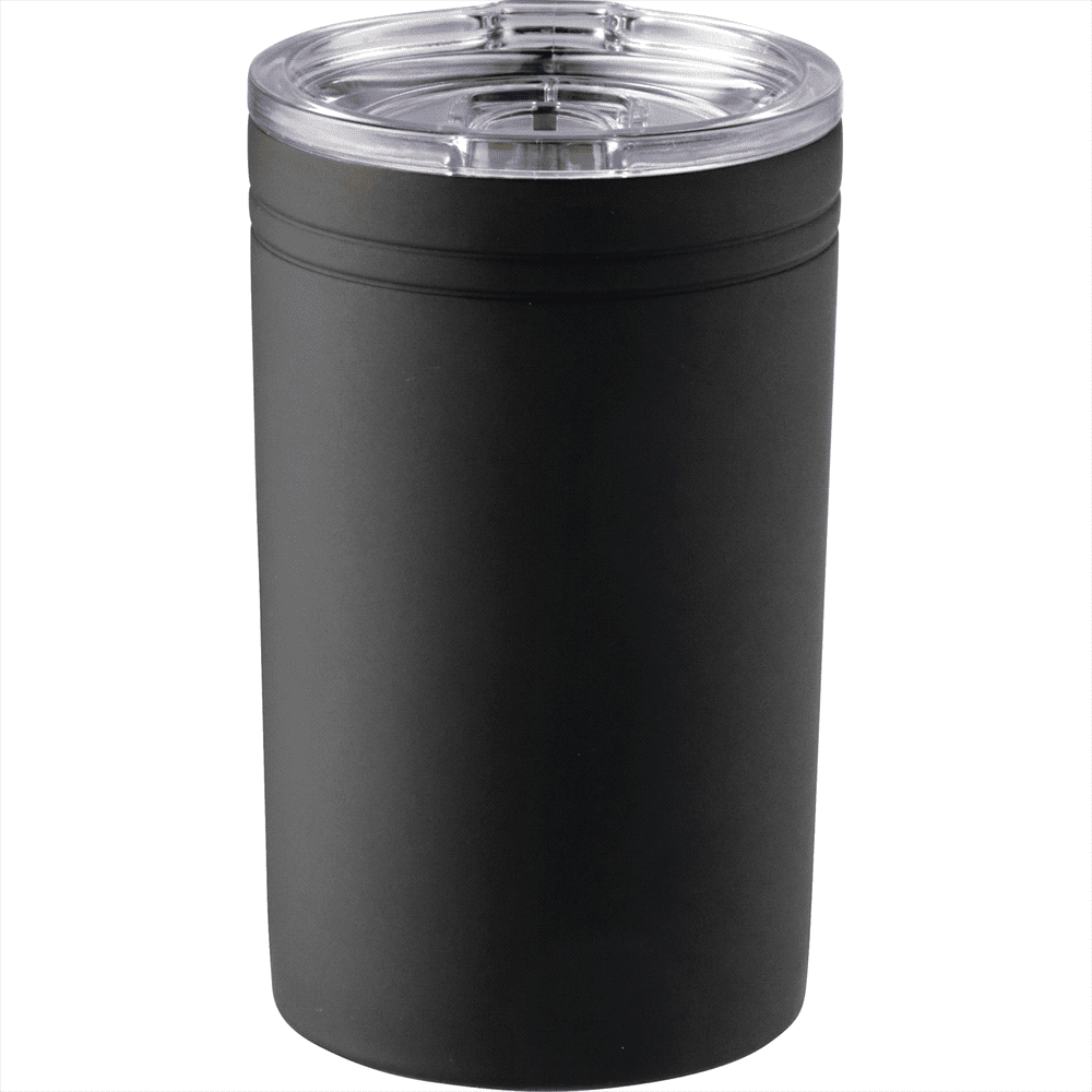 Features double-wall construction and is vacuum insulated with a clear, press-on lid with slide closure.