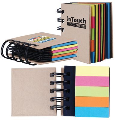 Spiral bound unbleached cardboard notebook with 5 blocks of (75mmL x 50mmH) repositional notepads and 1 block of 5 adhesive notes flags (Blue, Orange, Green, Pink, Yellow).