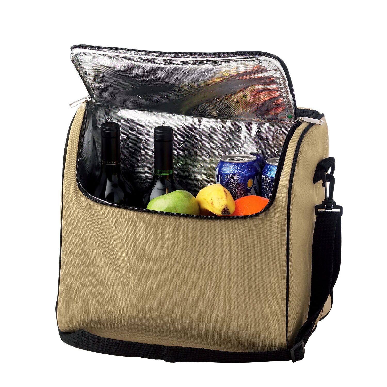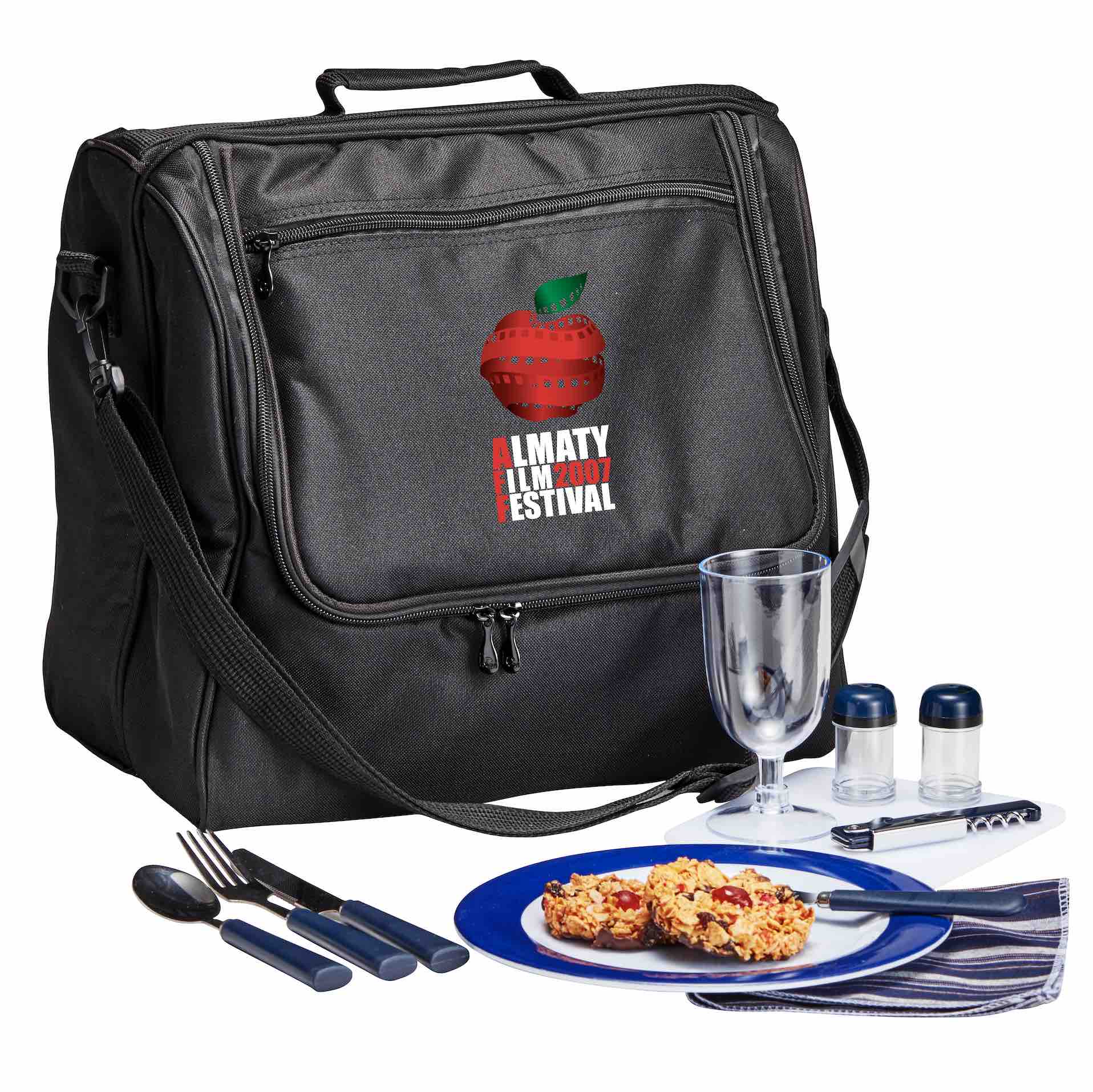 600D polypropylene 4 person setting (4 Spoons/Knives/Forks/Plates/Plastic Wine Glasses/Cotton Napkins, 2 Salt & Pepper Shakers, 1 Cutting Board, 1 Cheese Knife, 1 Bottle Opener). Picnic/cooler bag with large capacity cooler compartment and foil insulation. Supplied in polybag.