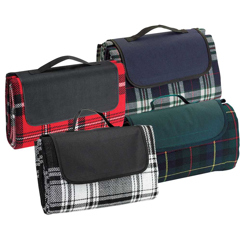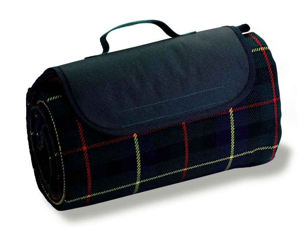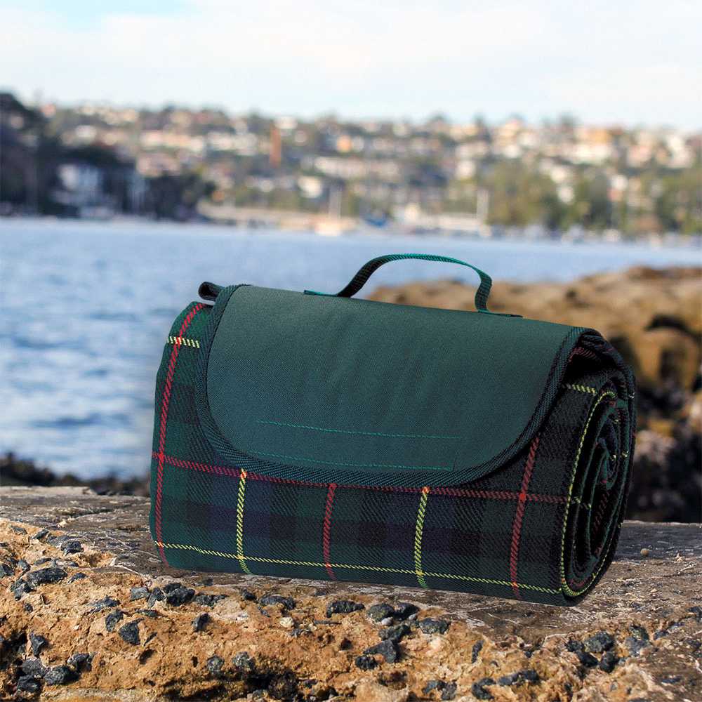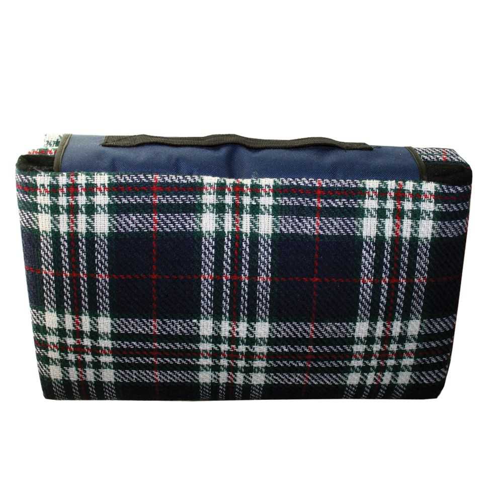 Perfect picnic accessory acrylic rug with PVC waterproof backing, velcro closure and carry handle.