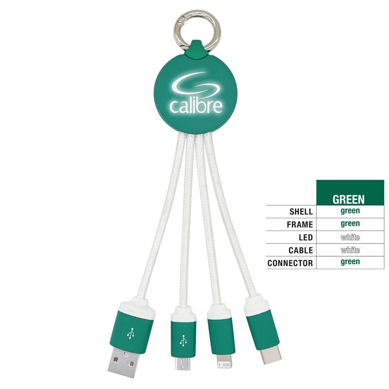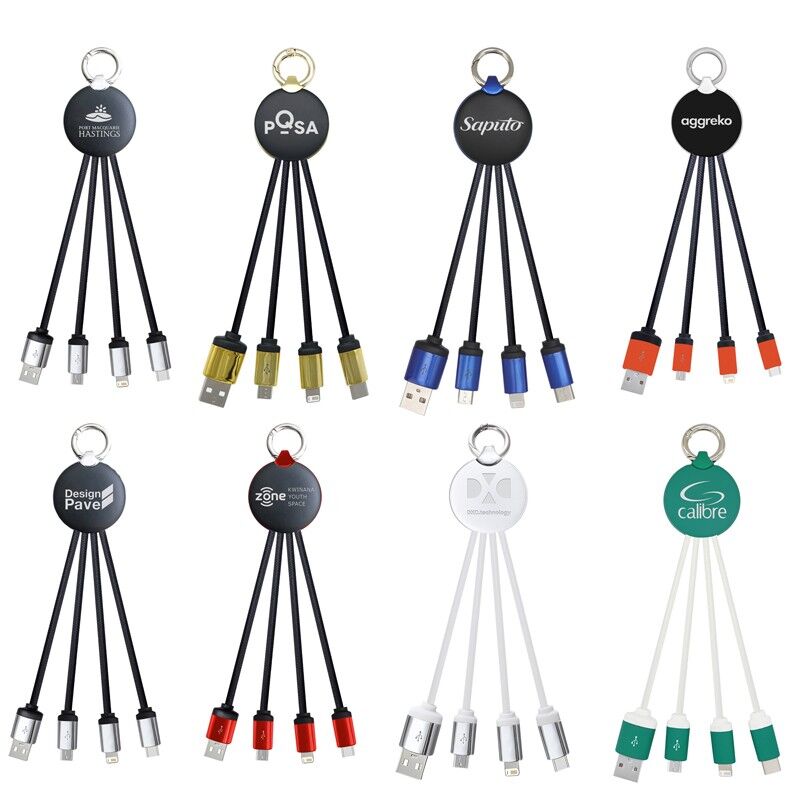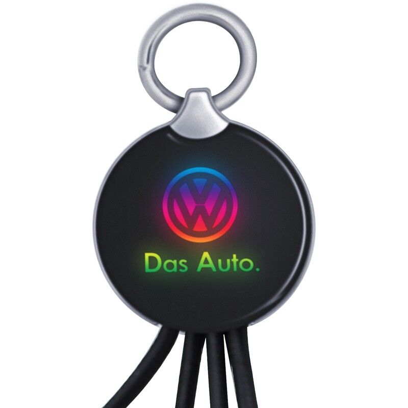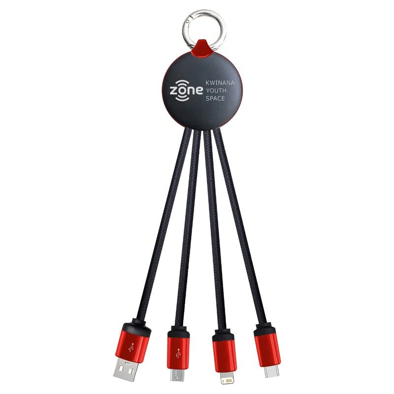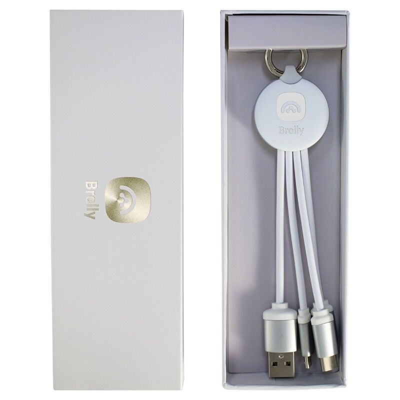 Features: Available in 7 standard configurations, the Atesso 3n1 charge cable with its double sided light up branding will bring your logo to life! What makes this product unique is its anti-tangle cable manufactured from high quality 24 AWG copper, plated heads, contrasting connectors and key-ring attachment. The Atesso can now be packaged in a press lock pouch or slide gift box that can be fully customised to further enhance your brand. Suitable for all mobile devices by providing USB to Micro USB, 6 Pin (lightning) and Type-C connections. Material: ABS, Nylon Fabric.