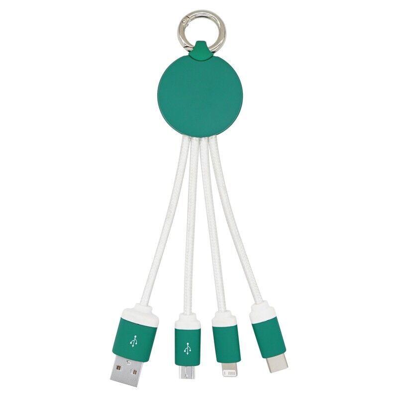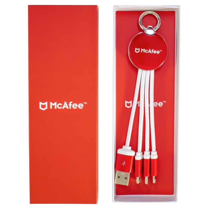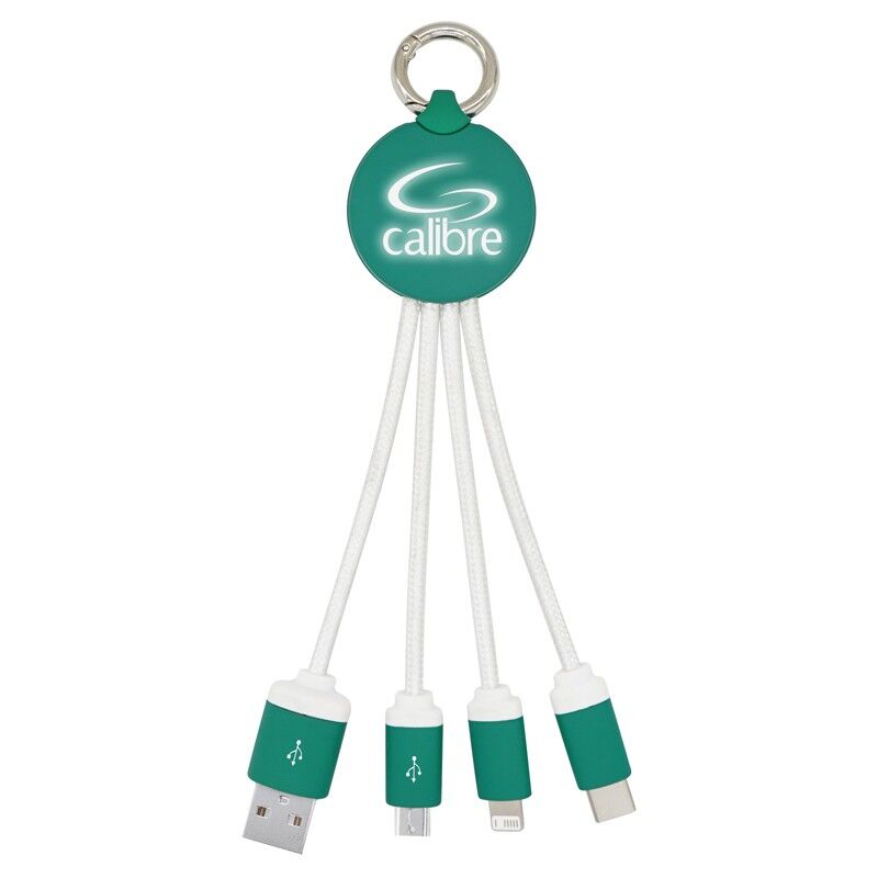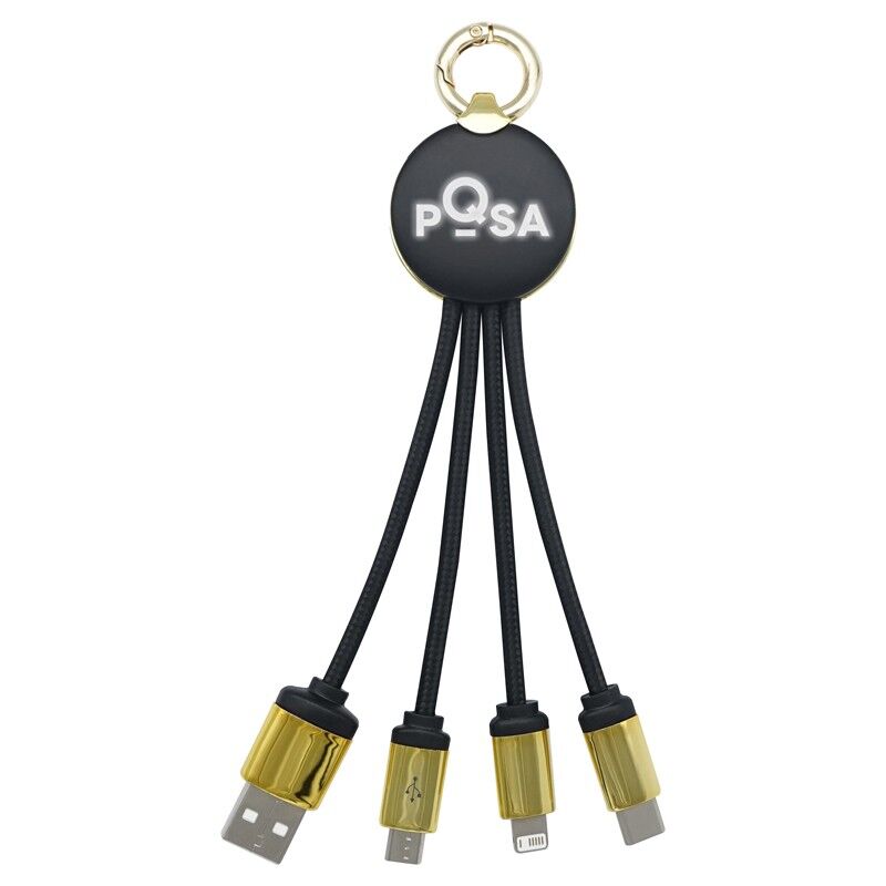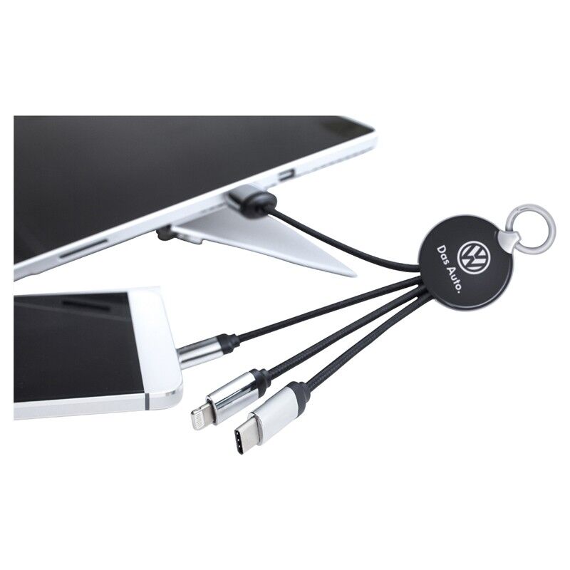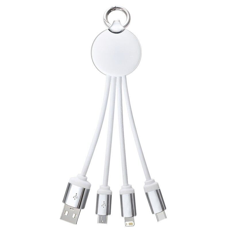Features: Available in 7 standard configurations, the Atesso 3n1 charge cable with its double sided light up branding will bring your logo to life! What makes this product unique is its anti-tangle cable manufactured from high quality 24 AWG copper, plated heads, contrasting connectors and key-ring attachment. The Atesso can now be packaged in a press lock pouch or slide gift box that can be fully customised to further enhance your brand. Suitable for all mobile devices by providing USB to Micro USB, 6 Pin (lightning) and Type-C connections. Material: ABS, Nylon Fabric.