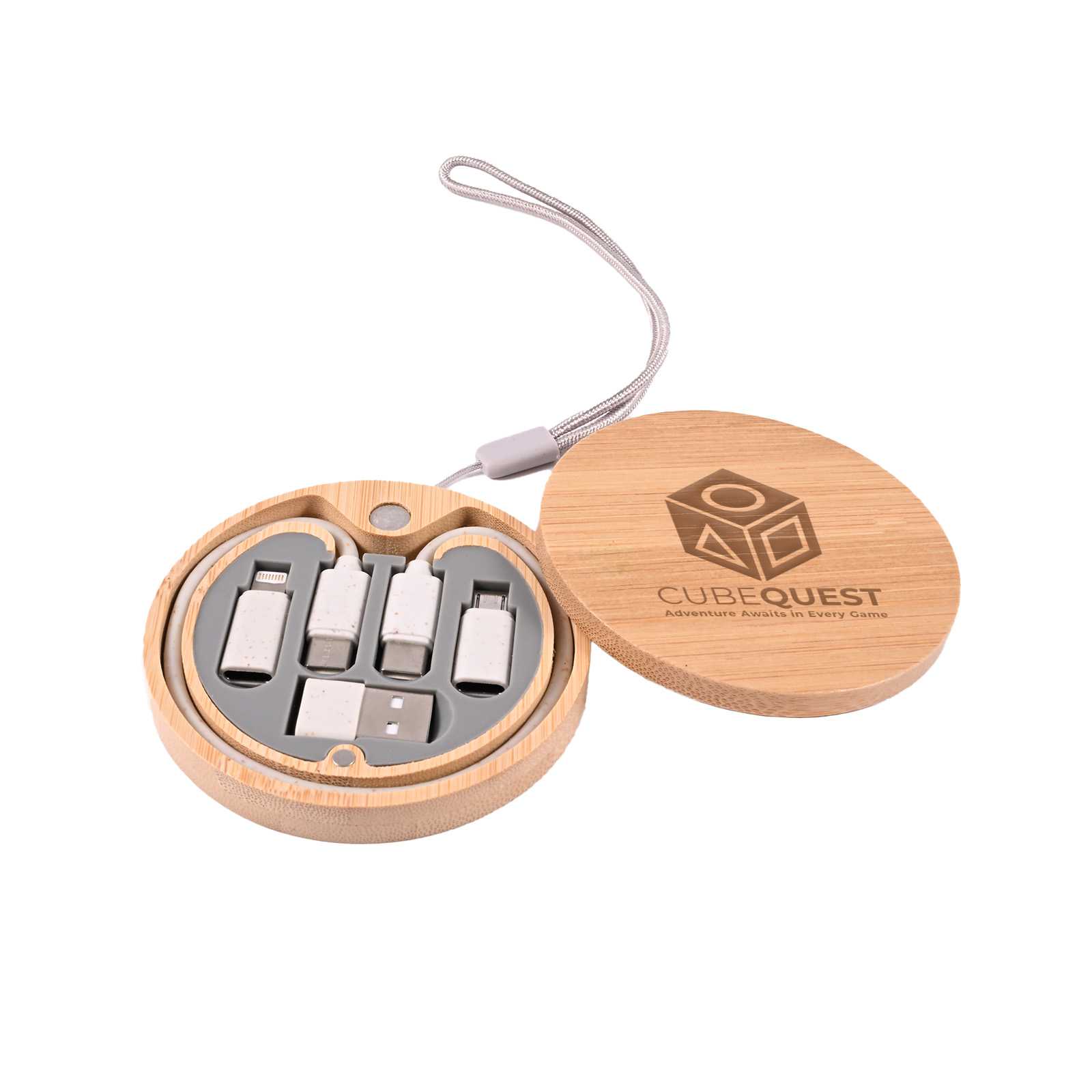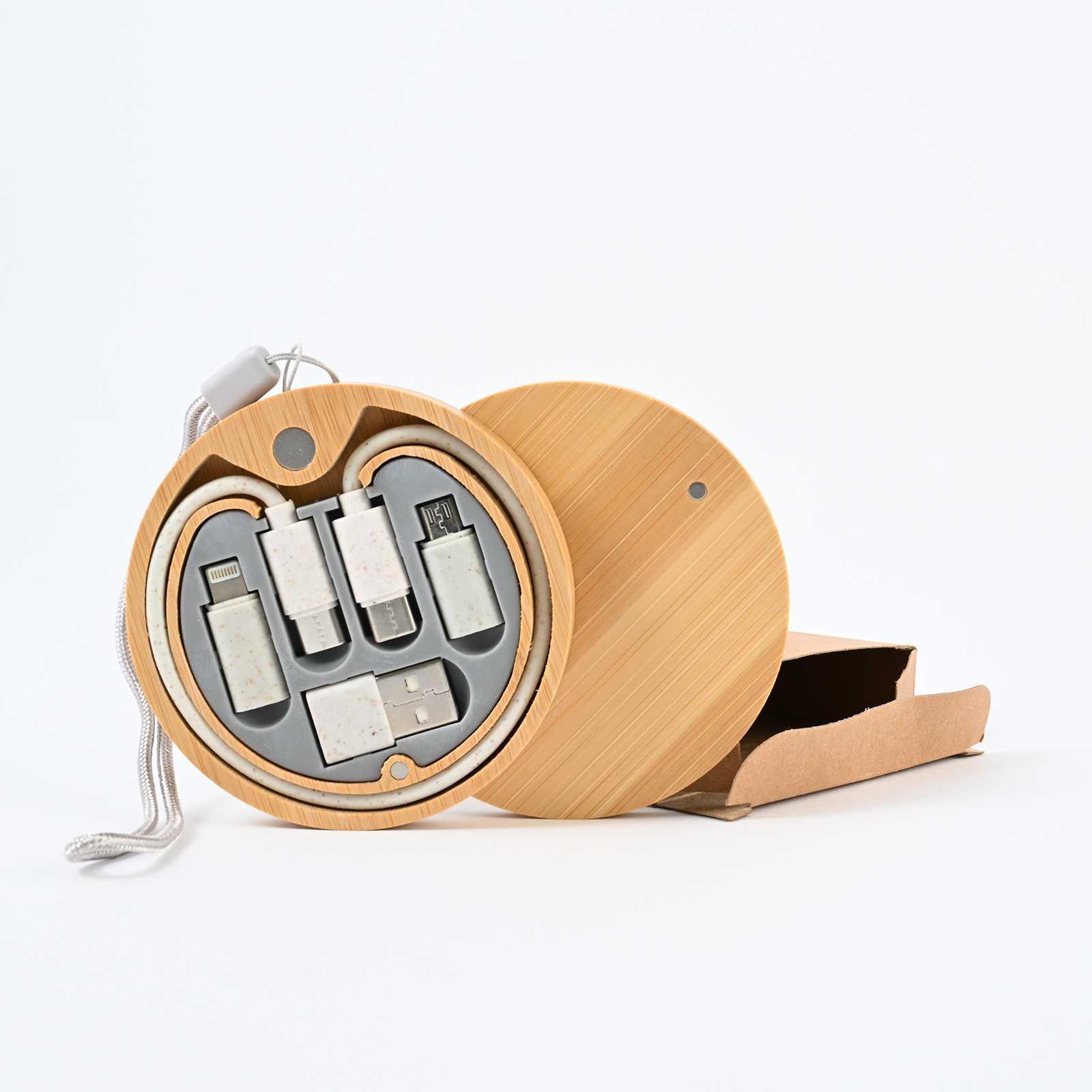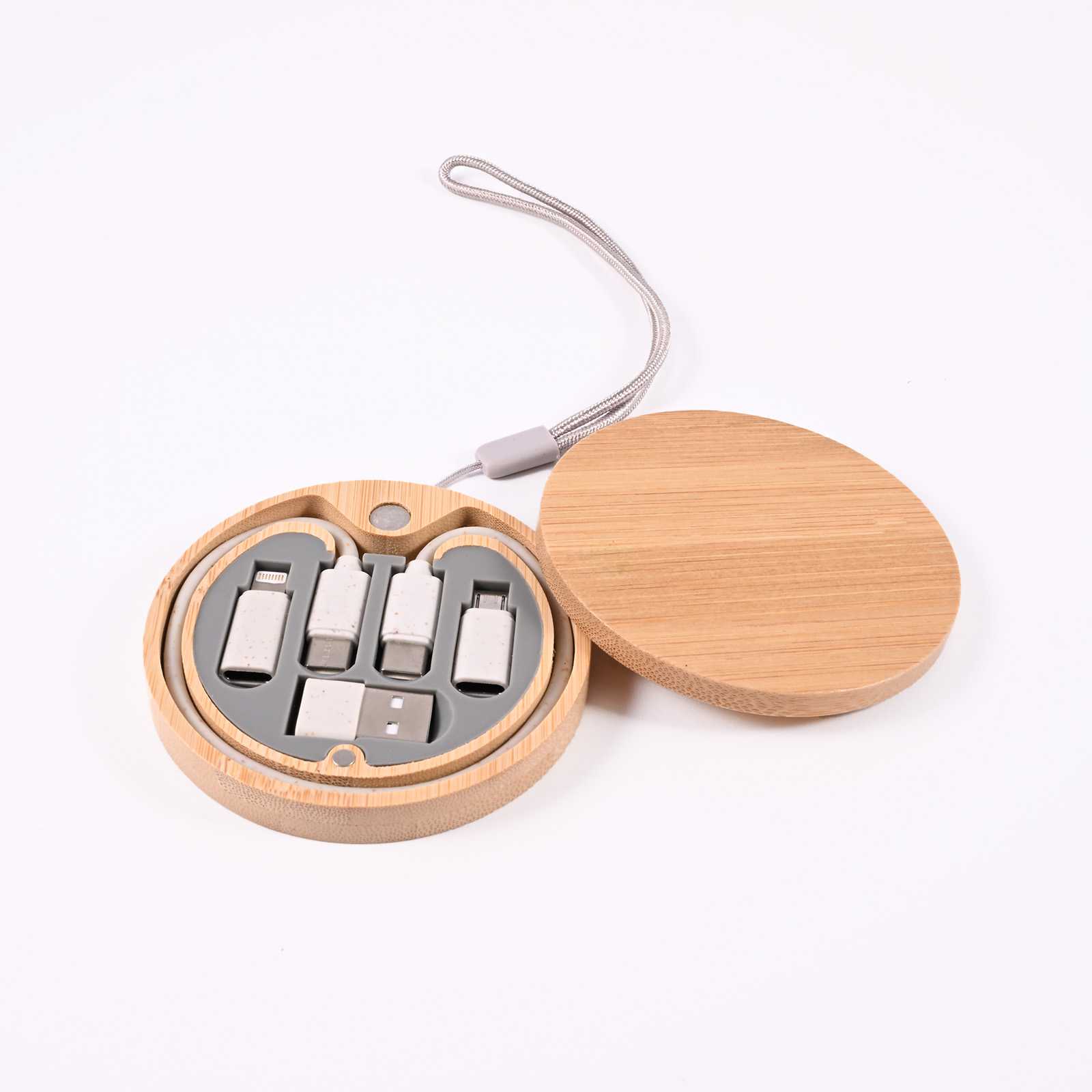 Introducing the Reveal Cable Set – a stylish and eco-friendly charging solution designed with natural bamboo and wheatstraw accents. The round bamboo cable set features a lid that slides open effortlessly, thanks to its magnetic design, providing easy access to the charging essentials within. A grey braided carry strap adds a convenient touch. Under the lid, discover a Type C to Type C cable alongside Type A, Micro USB, and iOS connectors, ensuring compatibility with a variety of devices. Crafted from wheat straw, both the cable and connectors are environmentally friendly, with a grey insert in the base for secure storage. This versatile and aesthetically pleasing cable set is not only functional but also showcases eco-friendly qualities. Elevate your charging experience with the Reveal Cable Set – where style meets sustainability in a compact and visually appealing design.