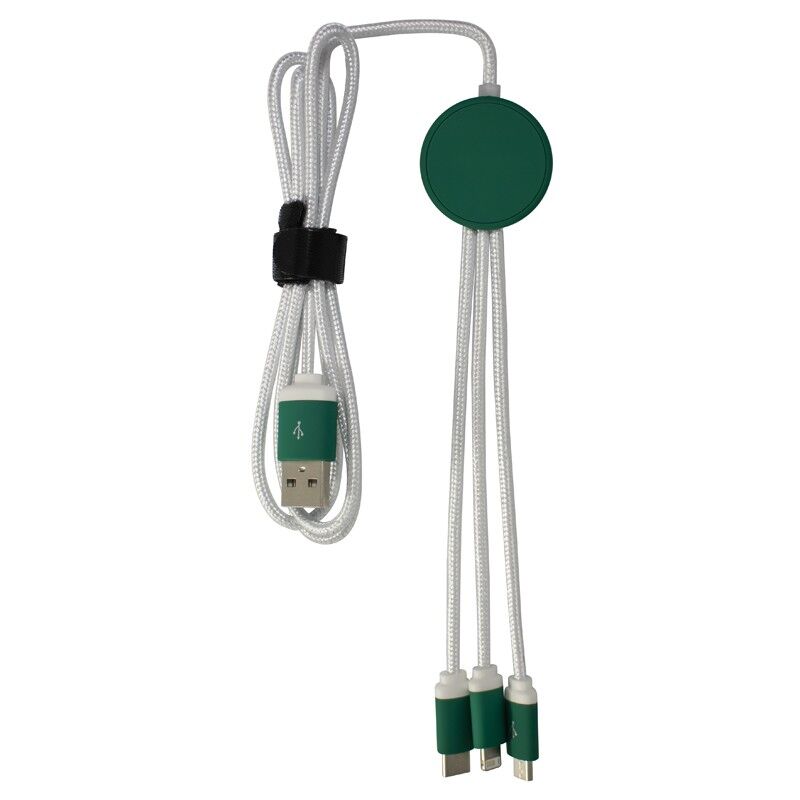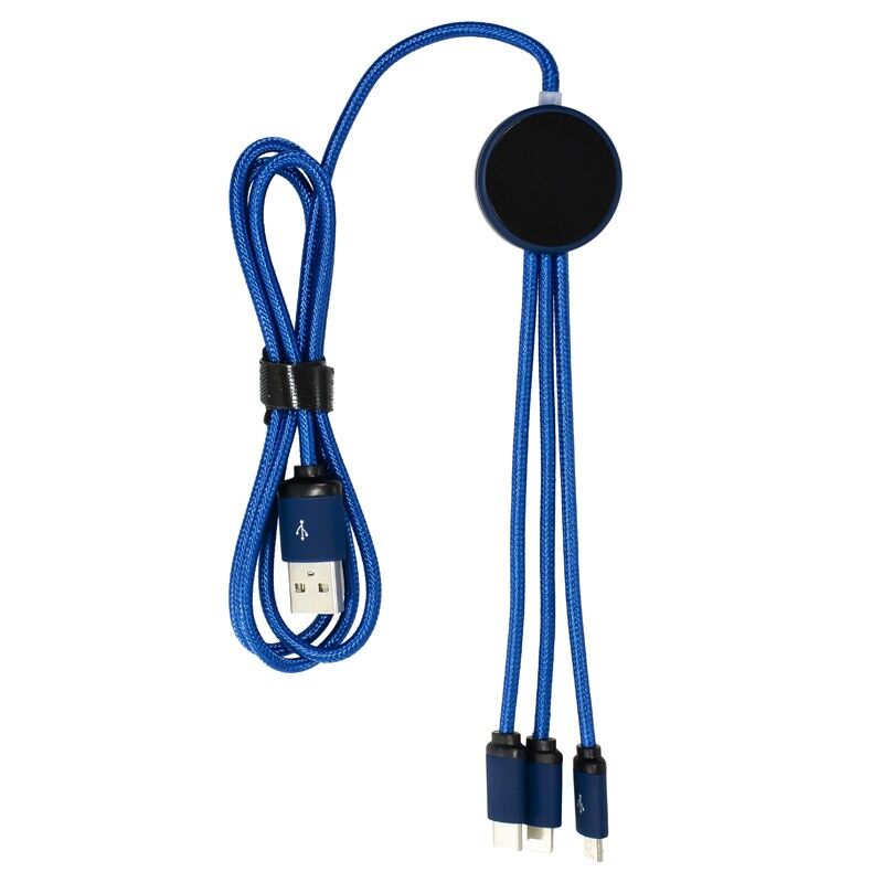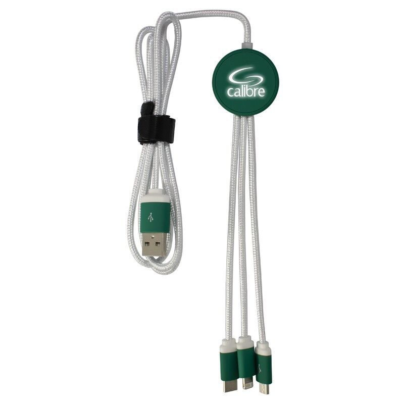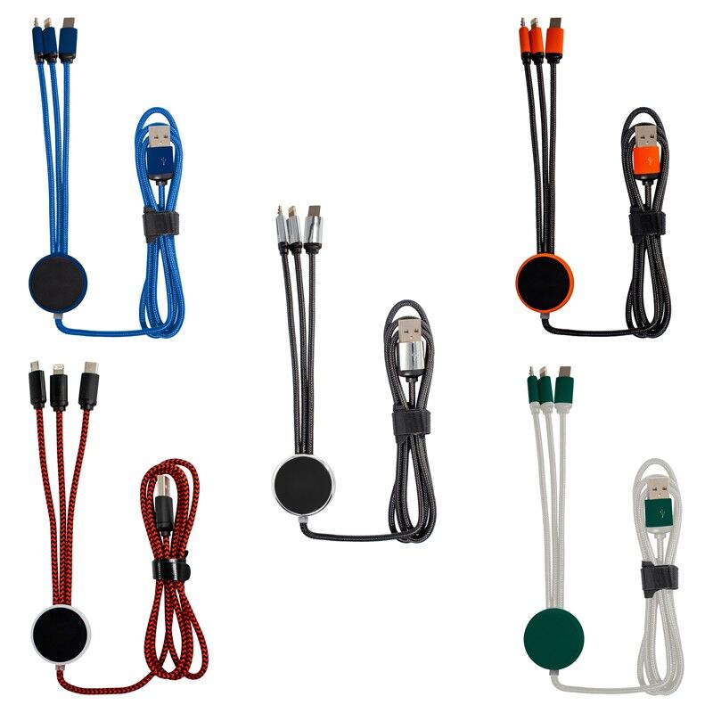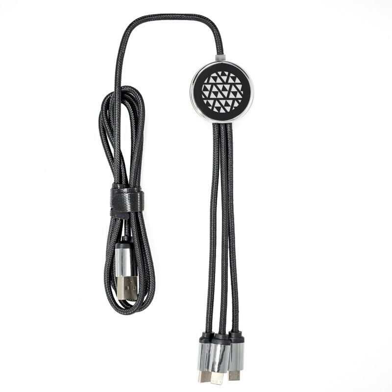 Features: The Trent 3n1 charge cable with its light up branding will bring your logo to life. Available in 5 standard colour configurations and in 2 cable lengths the Trent allows you to charge 3 devices at the same time. What makes this product unique is its anti-tangle cable manufactured from high quality 24 AWG copper, plated heads and contrasting connectors. The Trent can now be packaged in a press lock pouch or slide gift box that can be fully customised to further enhance your brand. Suitable for all mobile devices by providing USB to Micro USB, 6 Pin (lightning) and Type-C connections. Material: ABS, Nylon Fabric