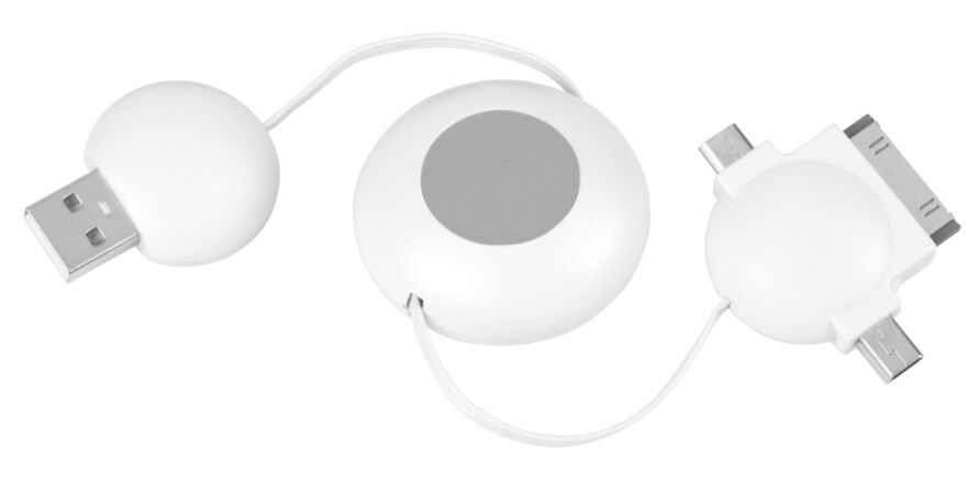 Features: Retractable universal USB cell phone charger. Charge via micro USB, mini USB and iPhone 30 pin connectors. Plugs to fit most mobile phone brands. Input & output 5 volts. Total cable length of 55cm. (phone not included).