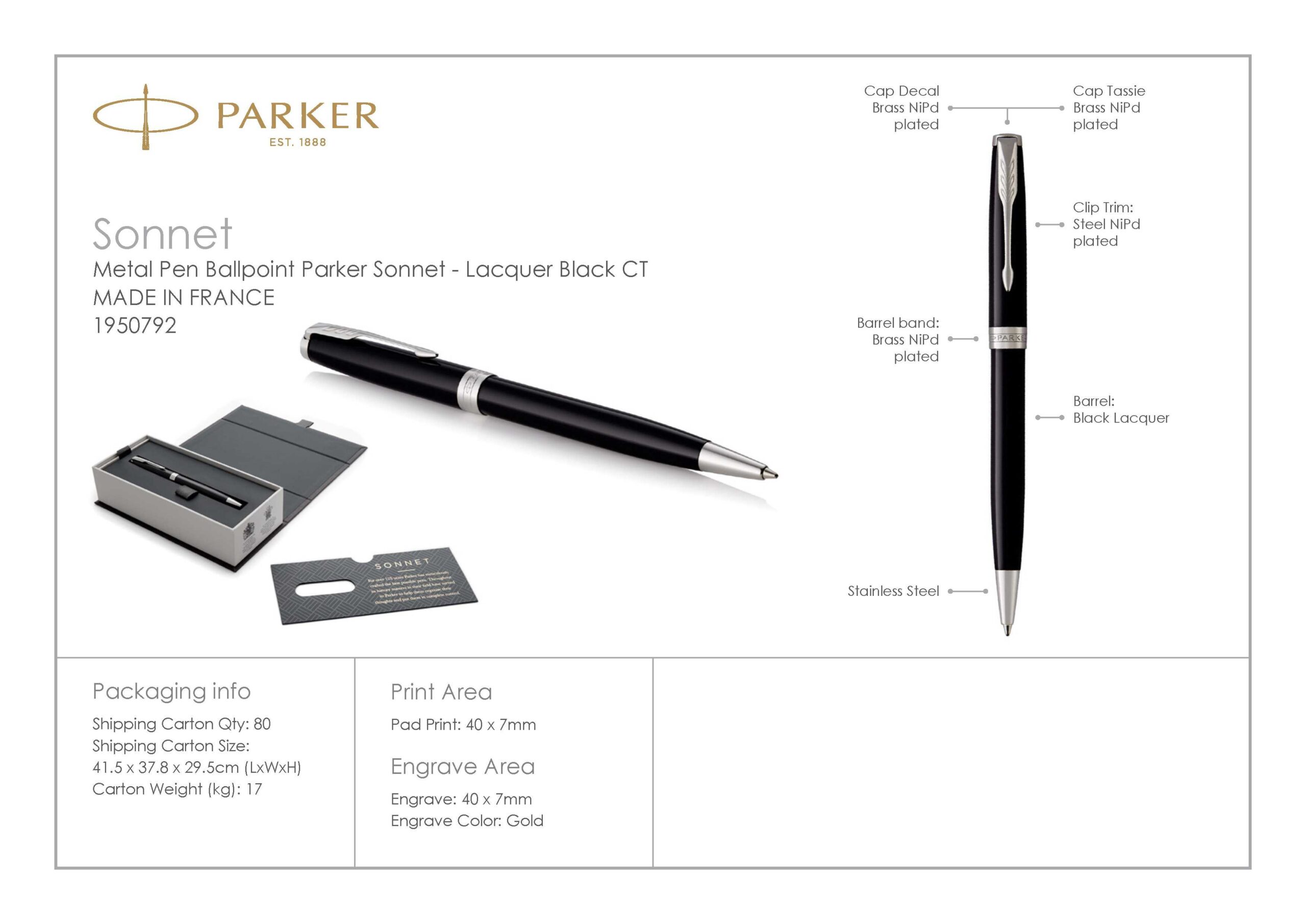 Stunning in lacquer black finish with elegant chrome trim, the Parker Sonnet Ballpoint Pen offers an elegant twist action, retractable ballpoint. Parker pens can be printed or engraved (gold finish) on cap or upper barrel providing great options for your client’s promotional logo.